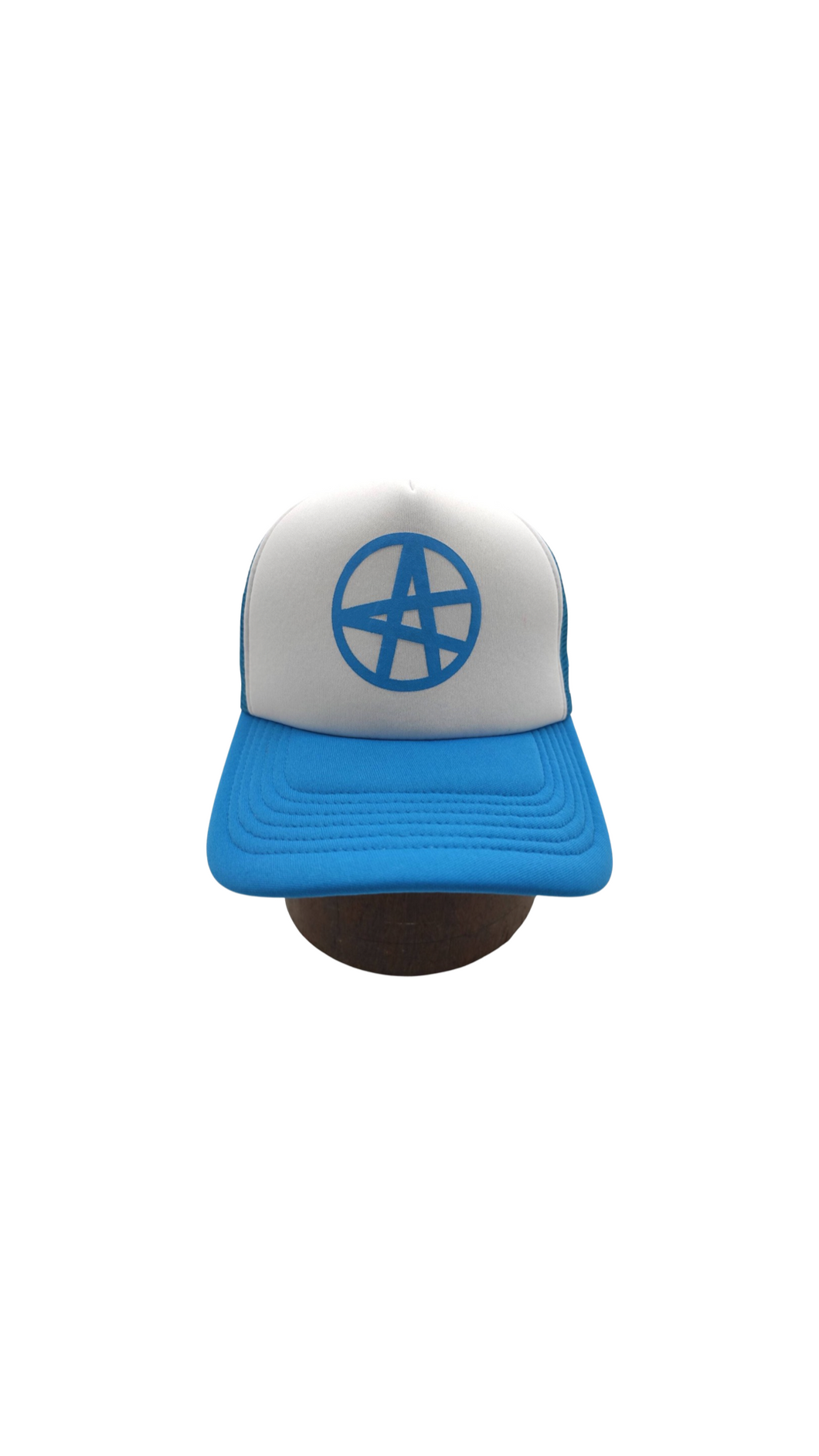 Trucker cap in sky blue and white. Logo in sky blue at front. Embroidered logo on side. Adjustable snapback fastening.